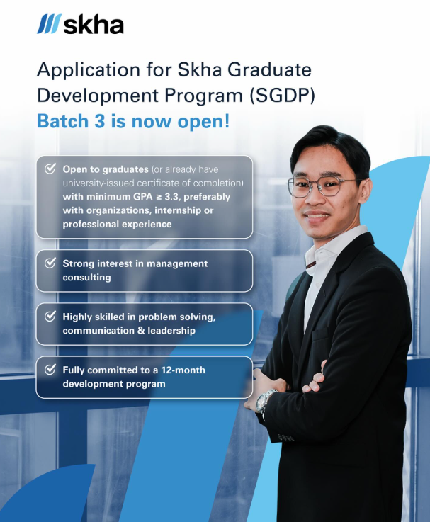 Skha Graduate Development Program (SGDP) returns for its third batch as a structured 12-month development program designed for proactive, responsible, and skilled individuals who aspire to build a career in management consulting. As an Associate Trainee, you will have the opportunity to grow and transform into a full-time Consultant at Skha.